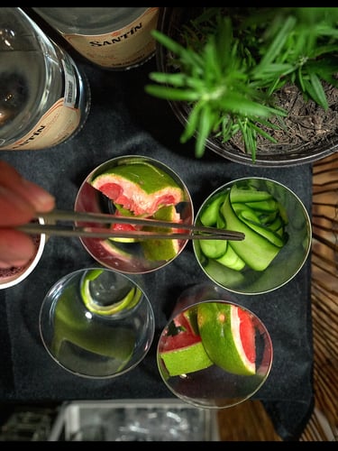 Tequila blanco, mezcal joven, Licor de melón, jugo de naranja, granadina - jamaica.